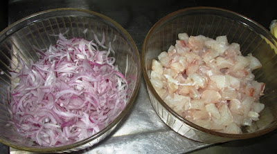 Corta-se 750g de robalo aos cubos e cebola roxa às rodelas fininhas.