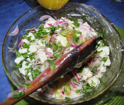 Tenho lido que este prato está em voga em Portugal. Há muitas receitas de ceviche, mas a que eu prefiro tem um toque especial da cozinheira, equatoriana, e não é amargo, pois usa limão crioulo (lima) e um toque de sumo de laranja para retirar a acidez excessiva, que muitos ceviches apresentam.